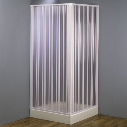 Box doccia in PVC a due lati, dotato di apertura angolare a soffietto. Ideale per l’installazione con piatto doccia posizionato ad angolo tra due pareti.