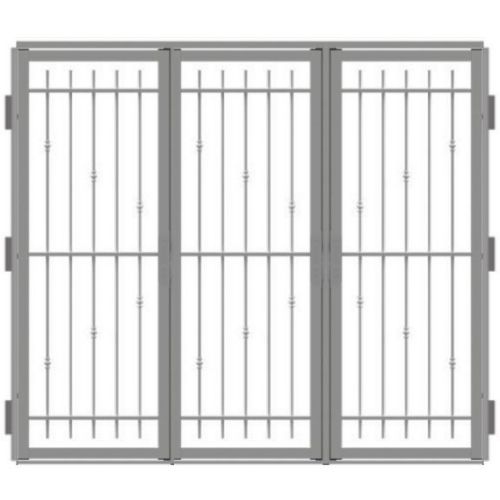 Grata in ferro a 3 ante dal design elegante, disponibile con Telaio a L (apertura a 90°) o a Z (apertura a 180°). Ogni incrocio tra elementi verticali e orizzontali le conferiscono un aspetto unico.