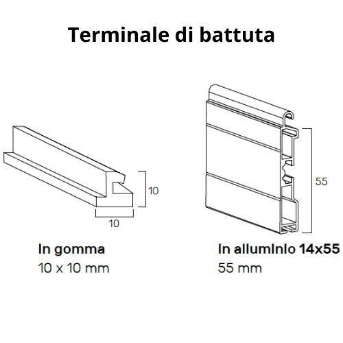 È possibile scegliere il terminale delle tapparelle DUERO® tra guarnizione di battuta in gomma e profilo in alluminio estruso. In caso di scelta del terminale in alluminio, questo verrà abbinato alla colorazione scelta per l’esterno della tapparella DUERO®. In caso di scelta dalla guarnizione di battuta in gomma non verranno predisposti i catenaccioli di sicurezza.