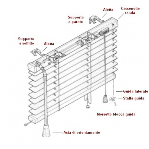 La tenda alla veneziana è realizzata con struttura in alluminio, e fornita con comando di orientamento lamelle ad asta e sollevamento a corda.