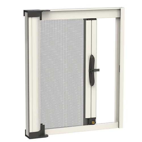 Zanzariera per finestra antivento con sistema di riavvolgimento a molla e scorrimento laterale a rullo con chiusura di sicurezza.