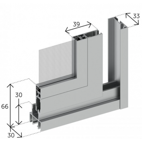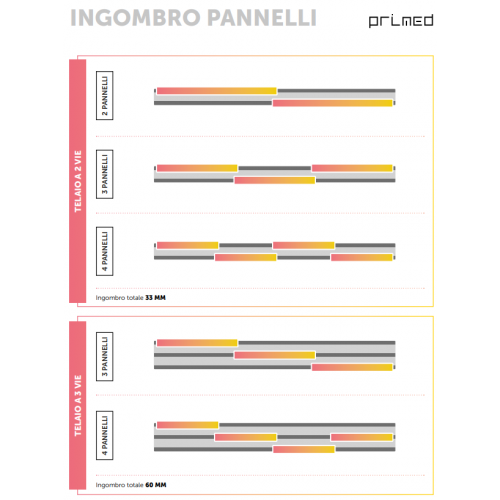 La zanzariera scorrevole con pannelli da 1 a 4 su un telaio con 2 vie ha un ingombro di soli 33 mm, mentre su un telaio a 3 vie l'ingombro è di soli 60 mm.