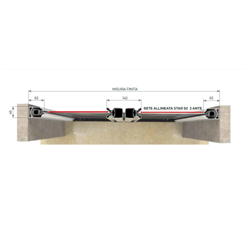 Le zanzariere scorrevoli con frizione STAR 45® a due ante si installano velocemente e con pochi fori, è possibile fermarle in qualsiasi posizione e sono dotate di serie compensatori telescopici, riuscendo a compensare in larghezza fino a 14mm in presenza di eventuale falso squadro o parete irregolare come esempio in pietra.